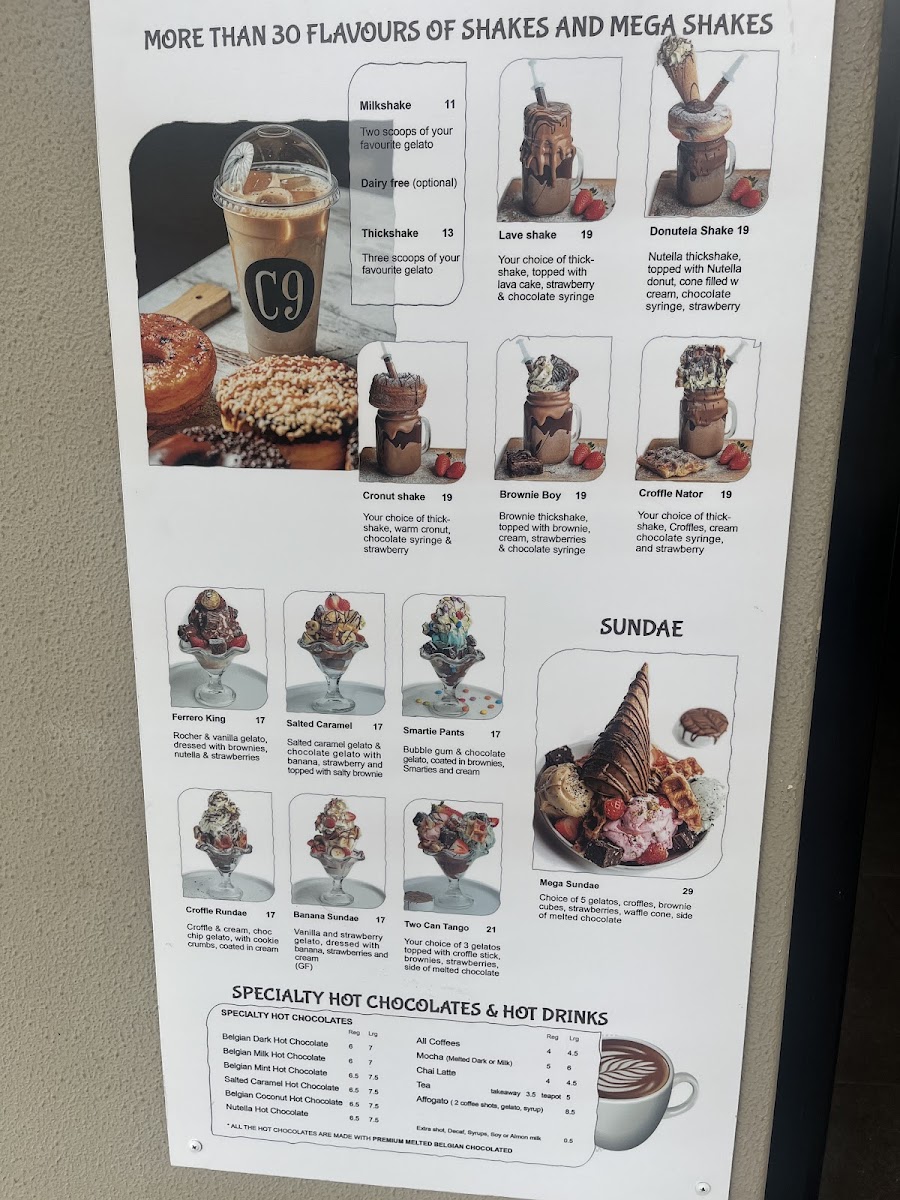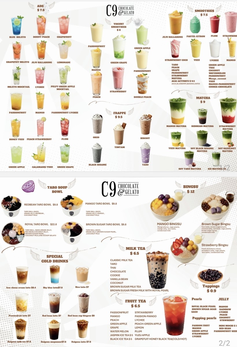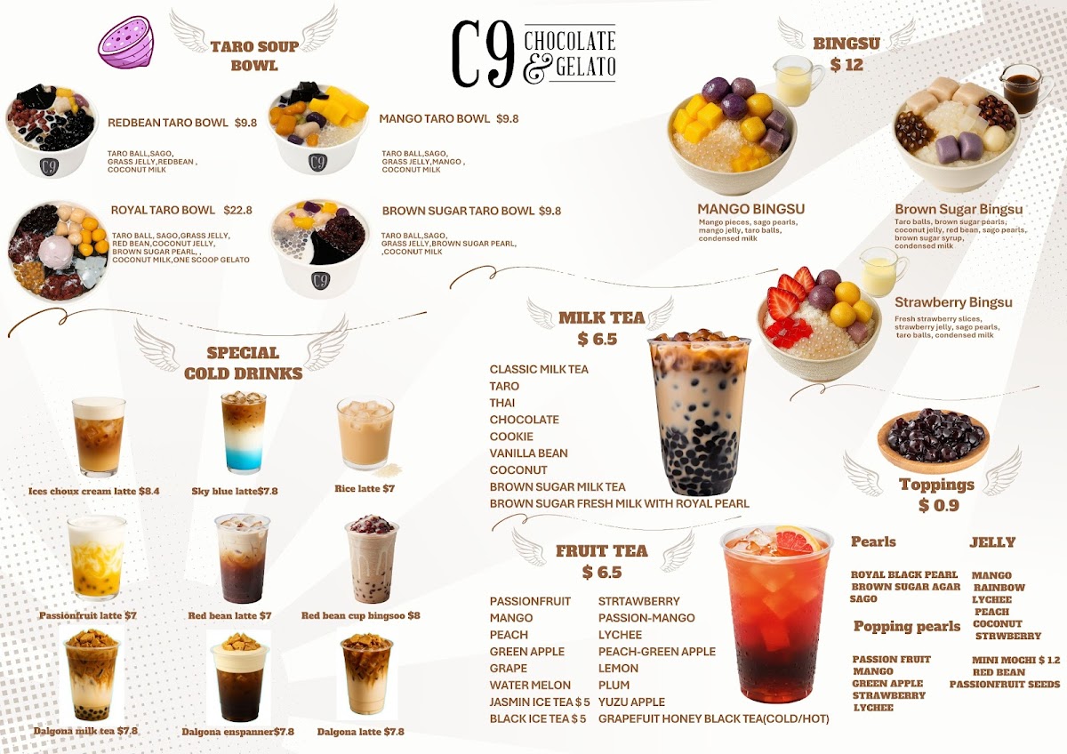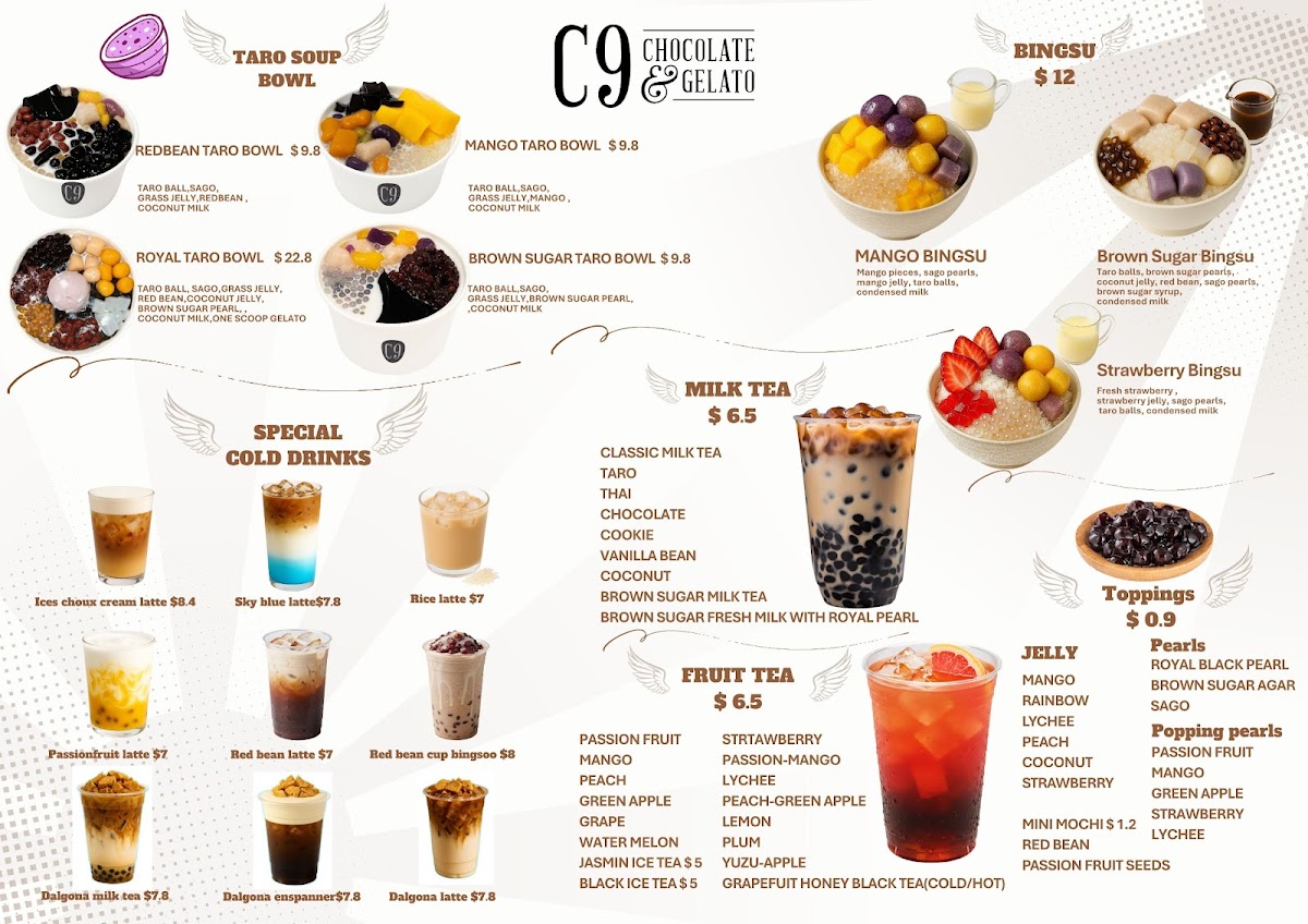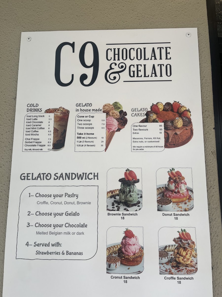 Overall, the menu at C9 Chocolate & Gelato Wahroonga offers an indulgent and diverse selection that caters especially well to dessert lovers and beverage enthusiasts. Signature items like the Large Dubai Strawberry Kanafeh Cup and LARGE DUBAI CHOCOLATE PISTACHIO KNAFEH BAR stand out for their rich, Middle Eastern-inspired flavors, while comforting drinks such as the Milk Hot Chocolate And Biscoff, Flat White, and Cappuccino provide a warm balance. The variety continues with unique options like the RED BEAN TARO BOWL and BROWN SUGAR TARO BOWL, alongside refreshing picks such as Iced Belgian Chocolate and Strawberry Matcha. Dessert highlights including the Biscoff Skillet Cookie, Molten Lava Cake, and Ferrero King Sundae showcase a strong focus on decadent treats, complemented by fun beverages like TARO MILK TEA and BROWN SUGAR FRESH MILK WITH ROYAL PEARL. The inclusion of lighter or fruity choices such as MANGO, LYCHEE, and PULPY GREEN APPLE MOCKTAIL adds balance, while gelato options like Single Scoop Gelato and Gelato And Sorbet (0.5 L) round out the experience. Altogether, the menu feels creative, generously varied, and clearly designed to satisfy a wide range of sweet cravings.