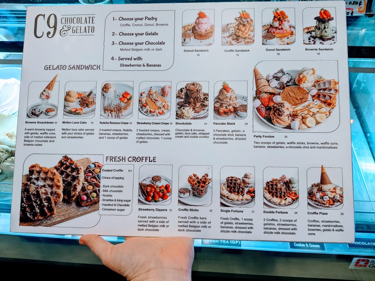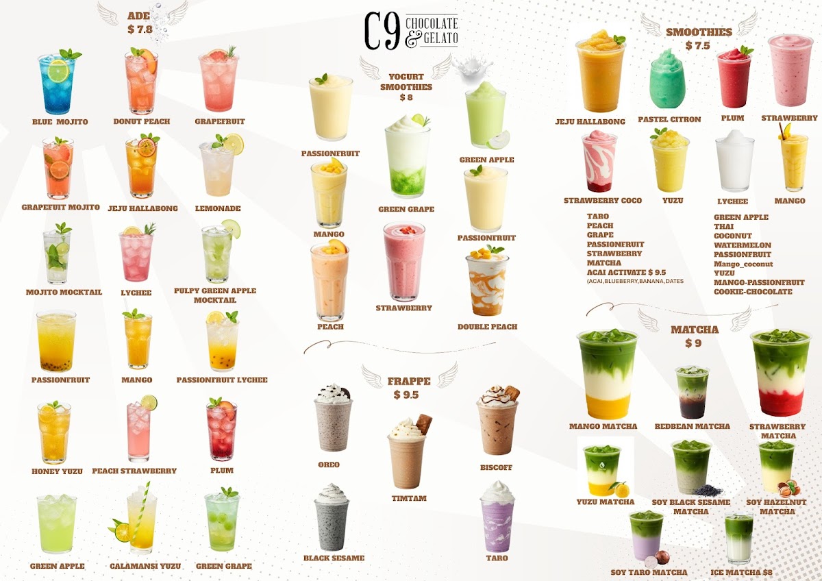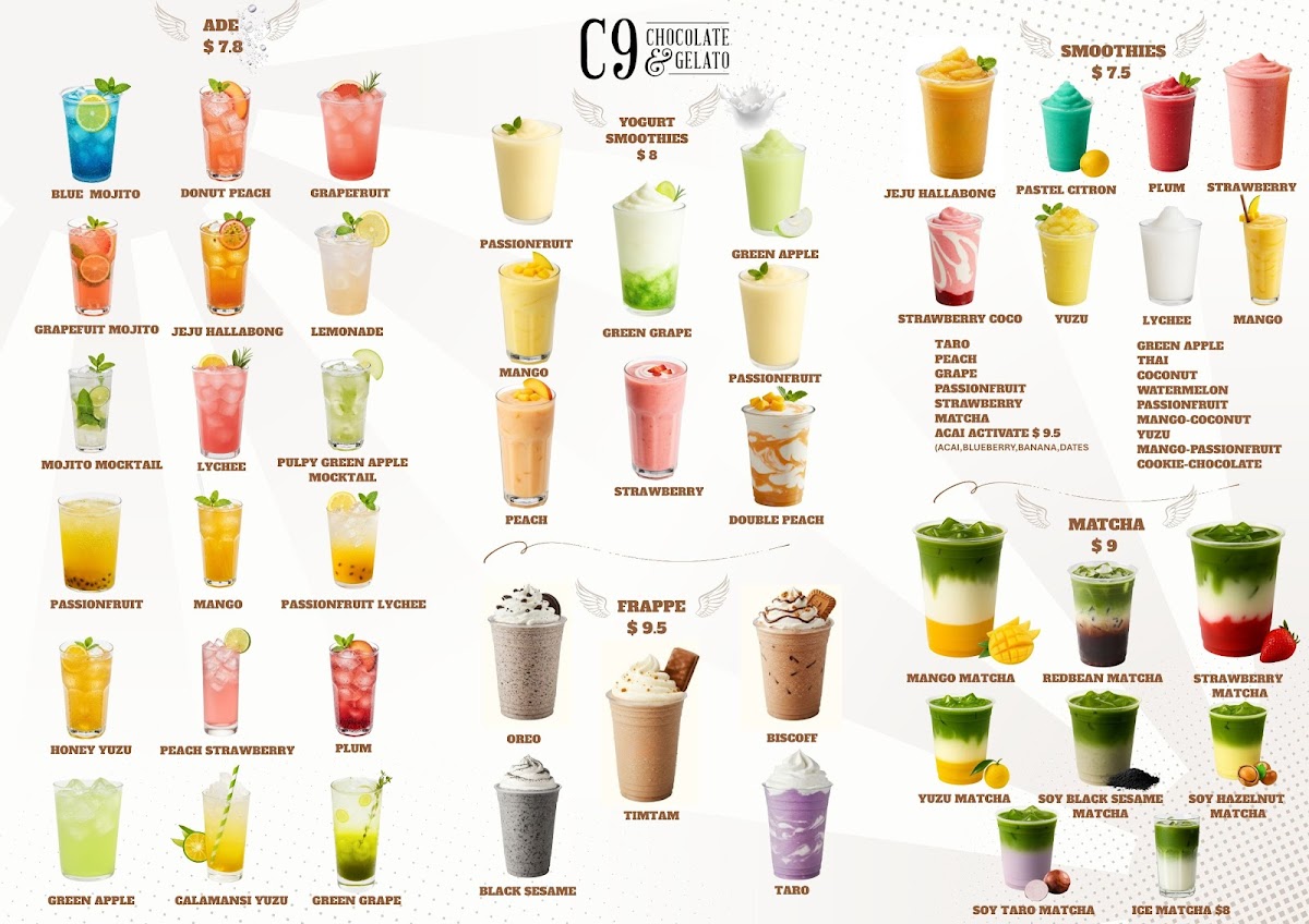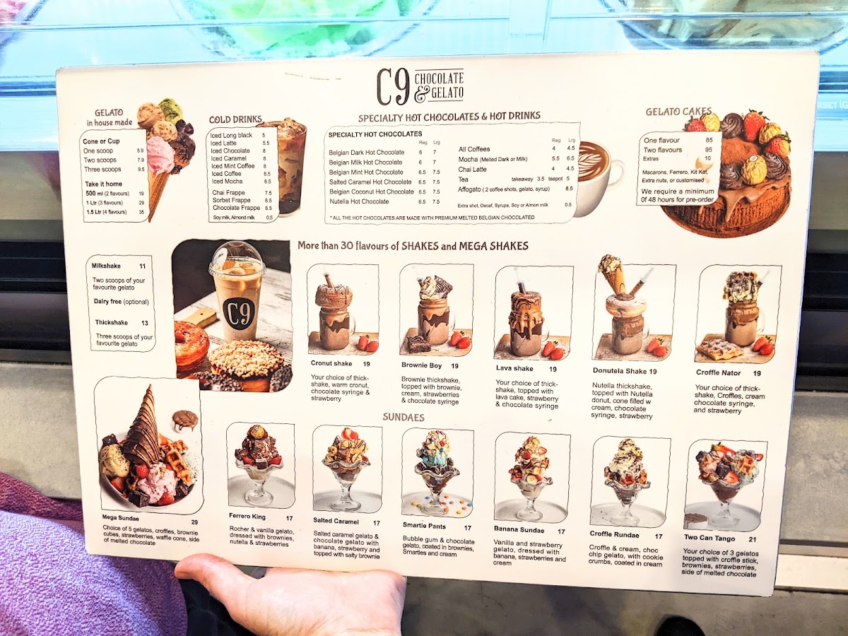 Overall, the menu at C9 Chocolate & Gelato Wahroonga offers an indulgent and diverse selection that caters especially well to dessert lovers and beverage enthusiasts. Signature items like the Large Dubai Strawberry Kanafeh Cup and LARGE DUBAI CHOCOLATE PISTACHIO KNAFEH BAR stand out for their rich, Middle Eastern-inspired flavors, while comforting drinks such as the Milk Hot Chocolate And Biscoff, Flat White, and Cappuccino provide a warm balance. The variety continues with unique options like the RED BEAN TARO BOWL and BROWN SUGAR TARO BOWL, alongside refreshing picks such as Iced Belgian Chocolate and Strawberry Matcha. Dessert highlights including the Biscoff Skillet Cookie, Molten Lava Cake, and Ferrero King Sundae showcase a strong focus on decadent treats, complemented by fun beverages like TARO MILK TEA and BROWN SUGAR FRESH MILK WITH ROYAL PEARL. The inclusion of lighter or fruity choices such as MANGO, LYCHEE, and PULPY GREEN APPLE MOCKTAIL adds balance, while gelato options like Single Scoop Gelato and Gelato And Sorbet (0.5 L) round out the experience. Altogether, the menu feels creative, generously varied, and clearly designed to satisfy a wide range of sweet cravings.