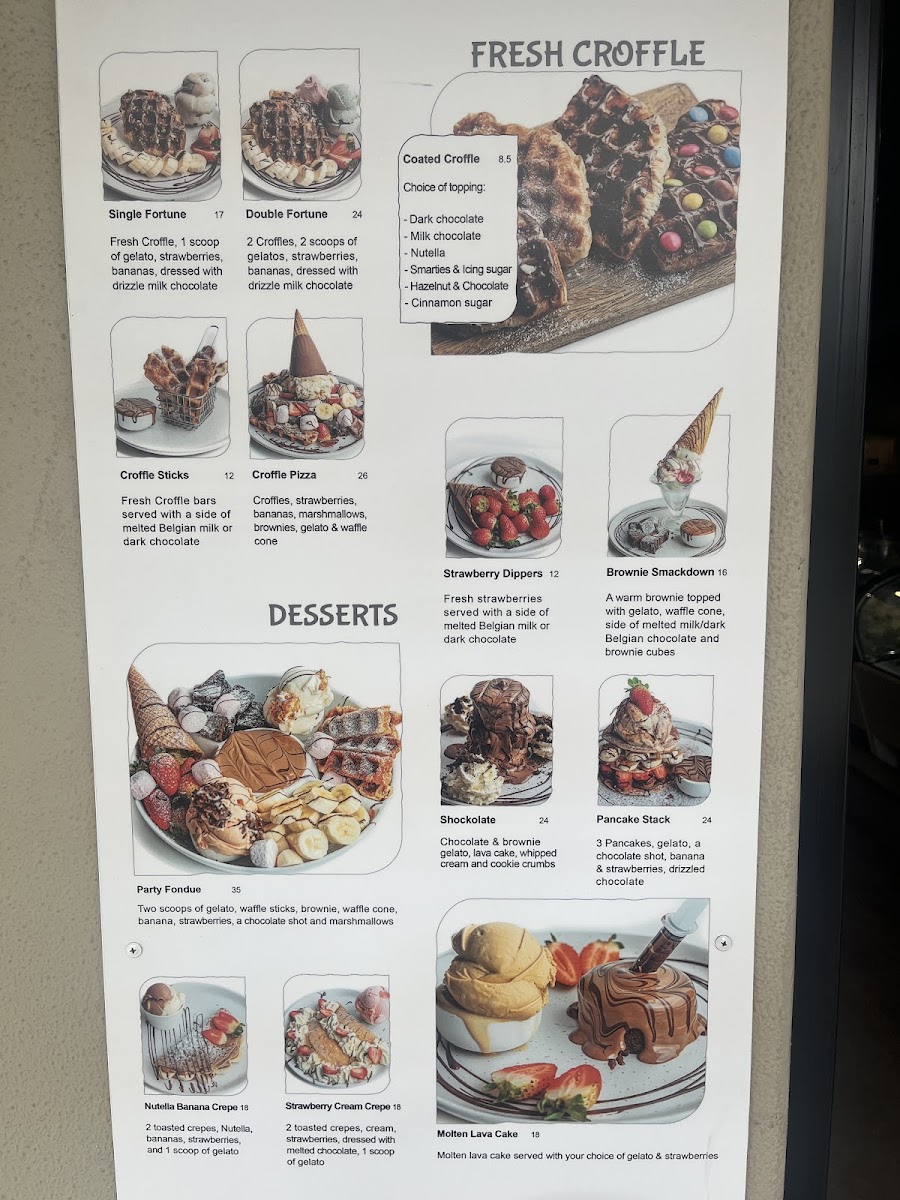 Three scoops of your choice of gelatos, topped with croffles, brownie cubes and a side of chocolate.
